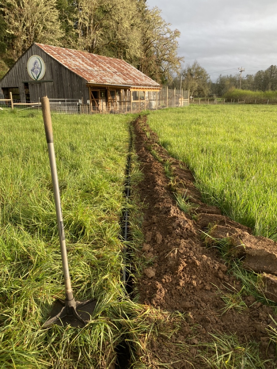 Justin hand dug a 200ft long trench from the pump-house to the barn so we could have running water down there. This is for convenience for tending to the animals but also for safety reasons. You might be asking yourself why he didn’t rent a machine to dig the trench for him? Well, the leach-field from the sewer is in our hayfield around the area where the trench needed to be so it was too risky to not do it by hand for fear we would hit something. Sadly, Justin didn’t get any of my help in digging this trench since my shoulder has been hurt. He did such a great job fitting digging in before work in the morning, during his lunch breaks, evenings and weekends. The piggies tried to help but they were really better at filing the trench back in! 🙂