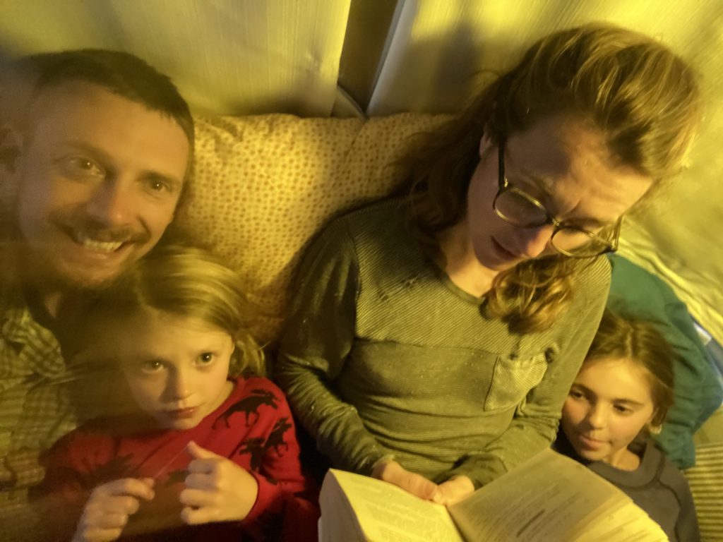 Azul was done at the dealers by noon so we were able cancel our precautionary 2nd night reservation at the KOA and hit the road toward Canada. The rest of the afternoon was used driving and stopping for groceries, arriving at our next camping spot just in time for some Harry Potter reading and bedtime for the girls.