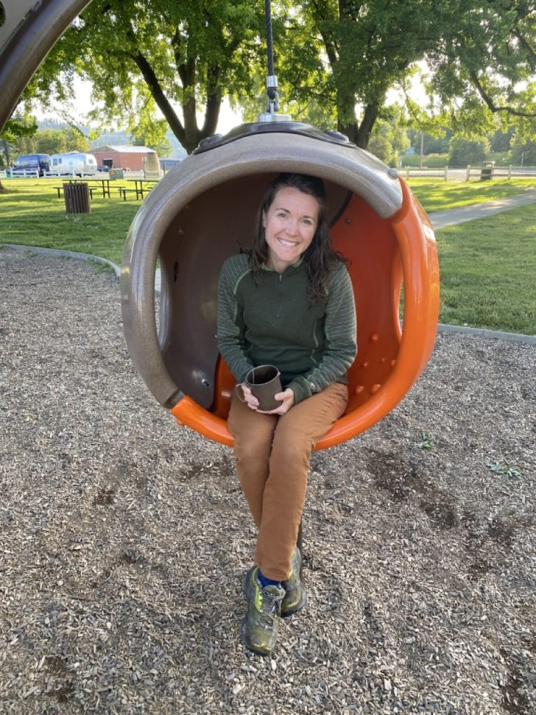 First thing the next morning the girls put on their warm sweaters and zipped out to the playground to go explore.  We ate breakfast in the morning sunshine on a picnic table before we left for our driving day.