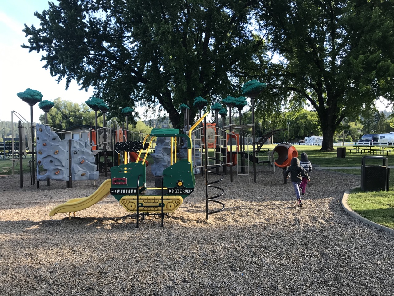 There was a large playground just outside our camper, a skate park, a train track far enough away to enjoy it without it blasting your ears off and a beautiful old working feed and grain mill bordering another side of the parking lot.  We happened to arrive in that magical evening glow the sun gives to everything just before it sets which made it feel that much more lovely.