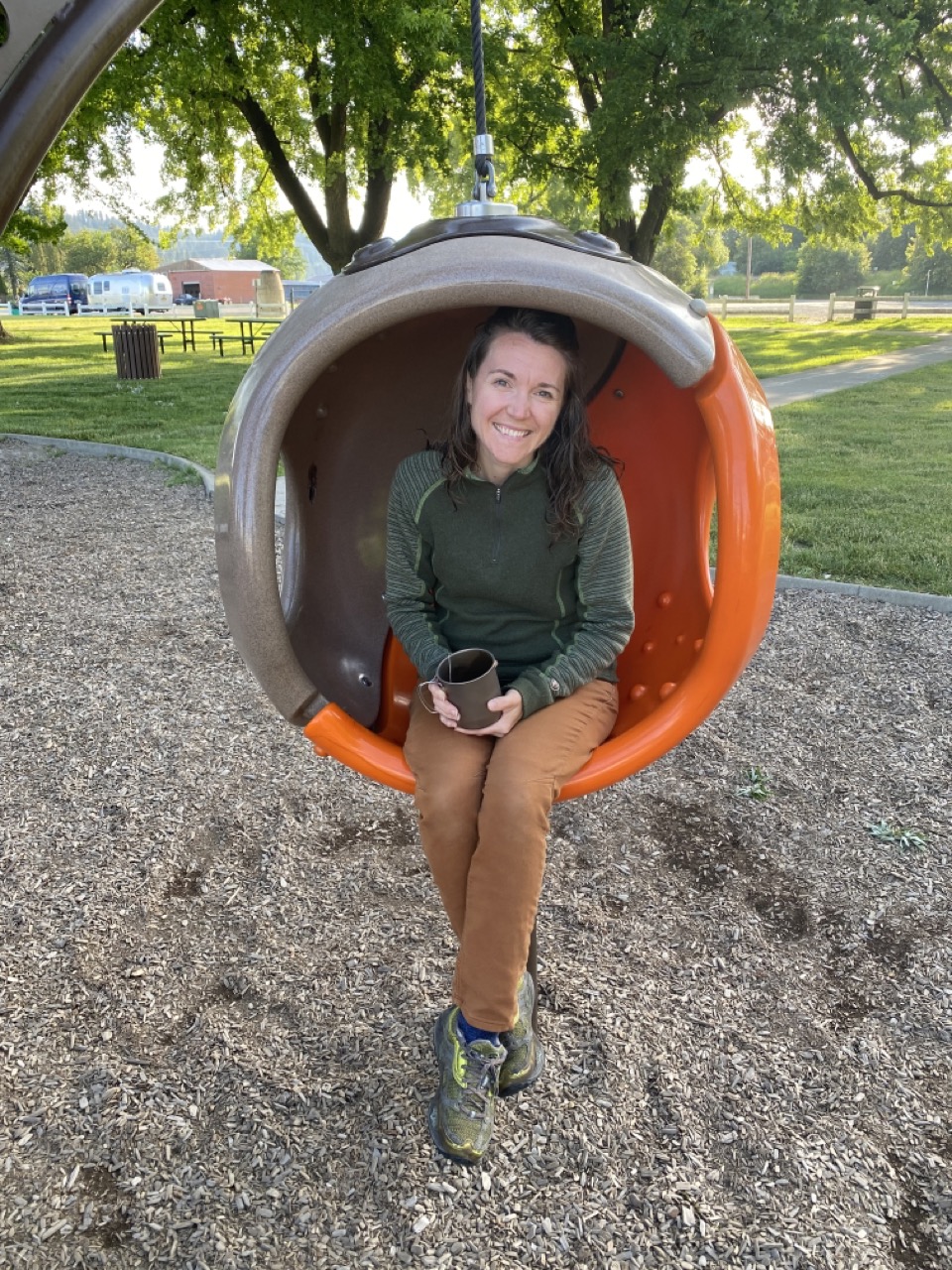 First thing the next morning the girls put on their warm sweaters and zipped out to the playground to go explore.  We ate breakfast in the morning sunshine on a picnic table before we left for our driving day.