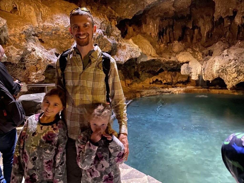 In today’s world, the park has preserved the outline of where one of the bathing pools used to be so visitors can visualize what it looked like as a bathhouse. To see one of the two hot springs you enter a man made entrance to a cave and can see the original hole in the “ceiling” where native people would lower themselves through using deer hide ropes. The hot springs was a stunning sight nestled into the cave as it was with crystal blue hot water. The cave formations framing it was such a magnificent sight. It was, however, extremely stinky! Sulfur pools we have visited outside have been stinky but bearable due to periodic fresh air gusts. In the cave, the smell was very potent and amplified with the heat of the steam. I can’t say we were too sad to leave that cave.