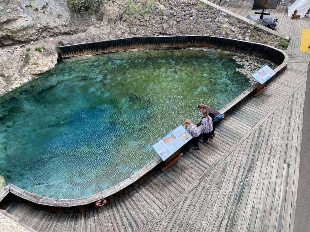 Outside there was another hot spring that was not as popular as the cave spring but much more pleasant for our nose. The pool was a mix of deep blues, crystal blues and pale teals. There was a little calf-height wall around it which was frightening. It was just the right height to make visitors comfortable with getting an up close look at the spring but also just the right height to trip over and fall in! A couple times other visitors walked behind me or the girls were peaking over the edge to get a closer look and I thought for sure one of us was going to do a belly flop. It would have been lovely for a second I’m sure but I’m also sure that we would be profusely reprimanded and asked to leave the park.