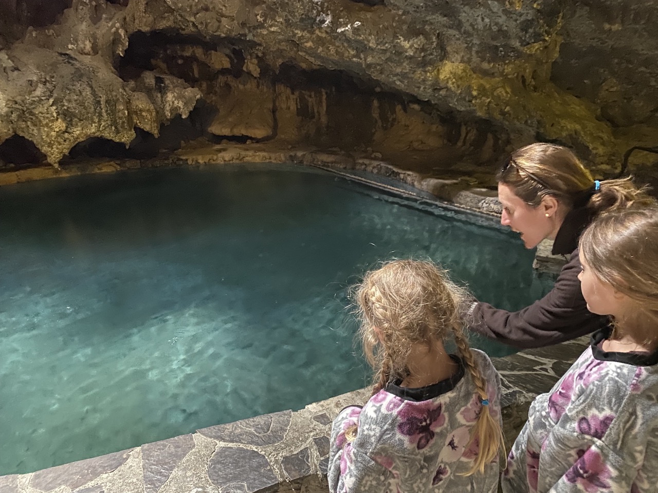 In today’s world, the park has preserved the outline of where one of the bathing pools used to be so visitors can visualize what it looked like as a bathhouse. To see one of the two hot springs you enter a man made entrance to a cave and can see the original hole in the “ceiling” where native people would lower themselves through using deer hide ropes. The hot springs was a stunning sight nestled into the cave as it was with crystal blue hot water. The cave formations framing it was such a magnificent sight. It was, however, extremely stinky! Sulfur pools we have visited outside have been stinky but bearable due to periodic fresh air gusts. In the cave, the smell was very potent and amplified with the heat of the steam. I can’t say we were too sad to leave that cave.