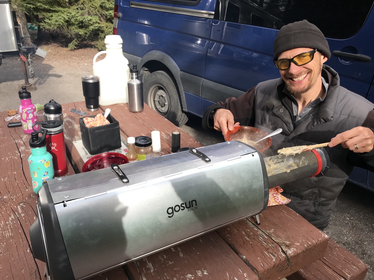 Once back at camp, we ate cheesy potatoes we cooked in our solar oven, though cheating and using solar-electricity from Azul due to all the bears. Leaving food outside cooking all day with bears all around didn’t seem like a smart plan! While we explored, the potatoes cooked in the van.