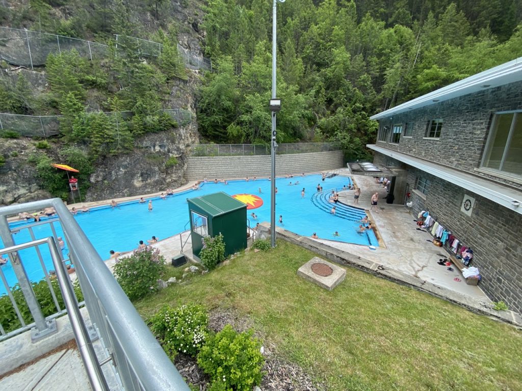 At the hot springs they had one giant sized pool that was their “cool pool” which was the temperature of a warm heated pool.  The other giant sized pool was the temperature of a hot tub fed by the hot spring.  Even though we weren’t snuggled up on a mountainside in the rocks like I always picture when I think of natural hot springs, it was pretty incredible.  They kept the hot pool at 102* which was just lovely to swim around in!  The pool was bordered on two sides with the natural rocky mountain so that was really neat.  We even spotted a big horn sheep on the distant cliff side while we were soaking.  We did use the cool pool twice to cool off a bit and that was fun too.