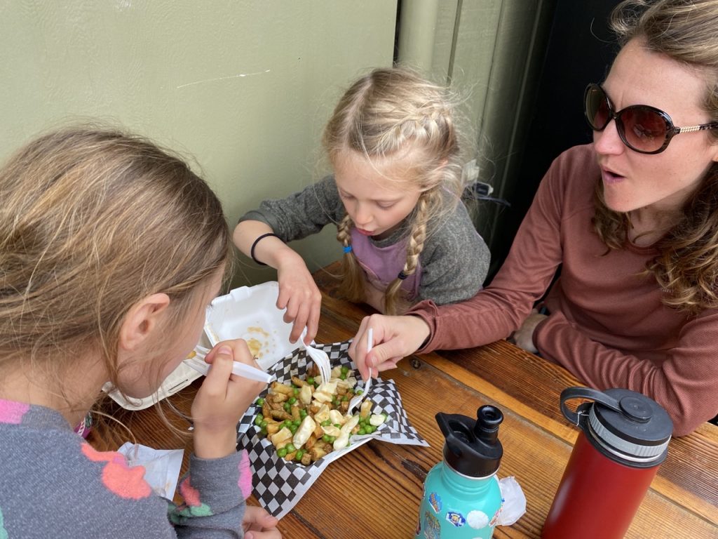 And, because we were in Canada, we had to let the girls taste poutine in town at the Snack Bar which was gluten free friendly.  We tried their marinara vegan poutine as well as their traditional gravy topped poutine.  We gave it two thumbs up.