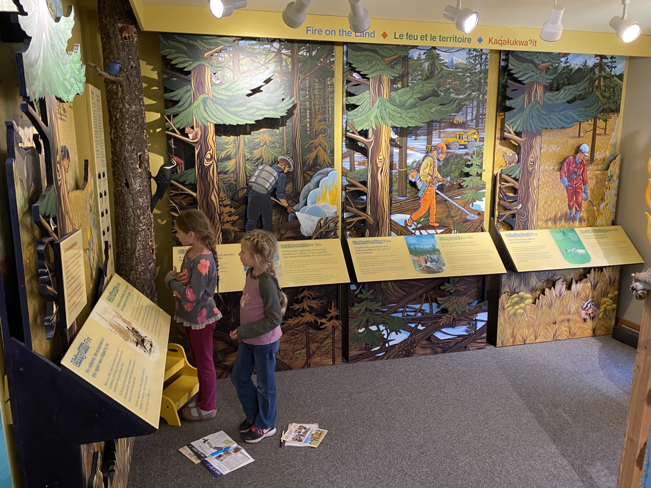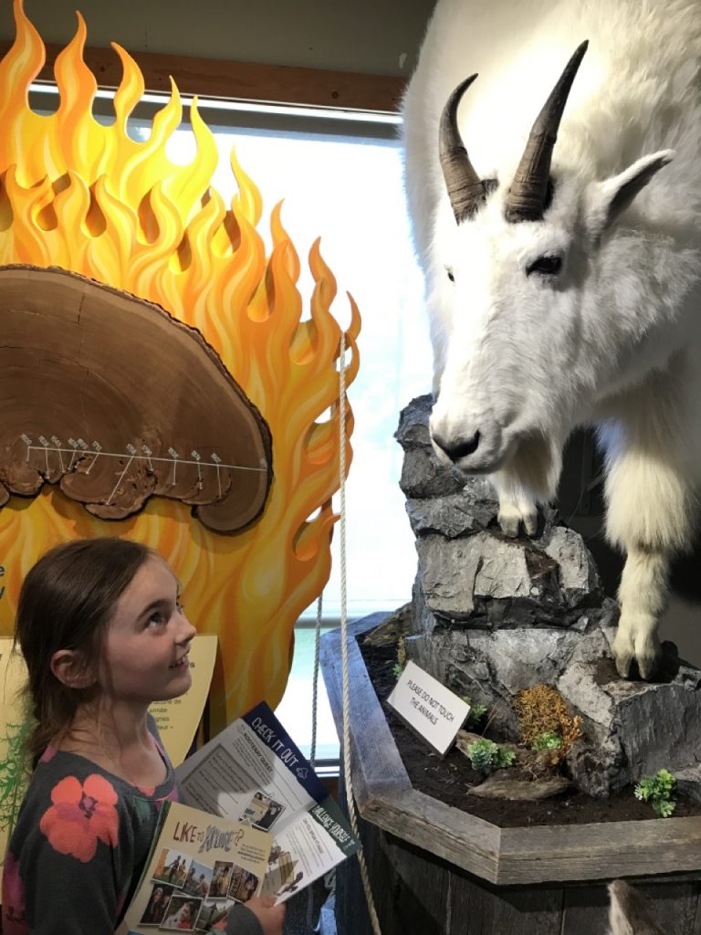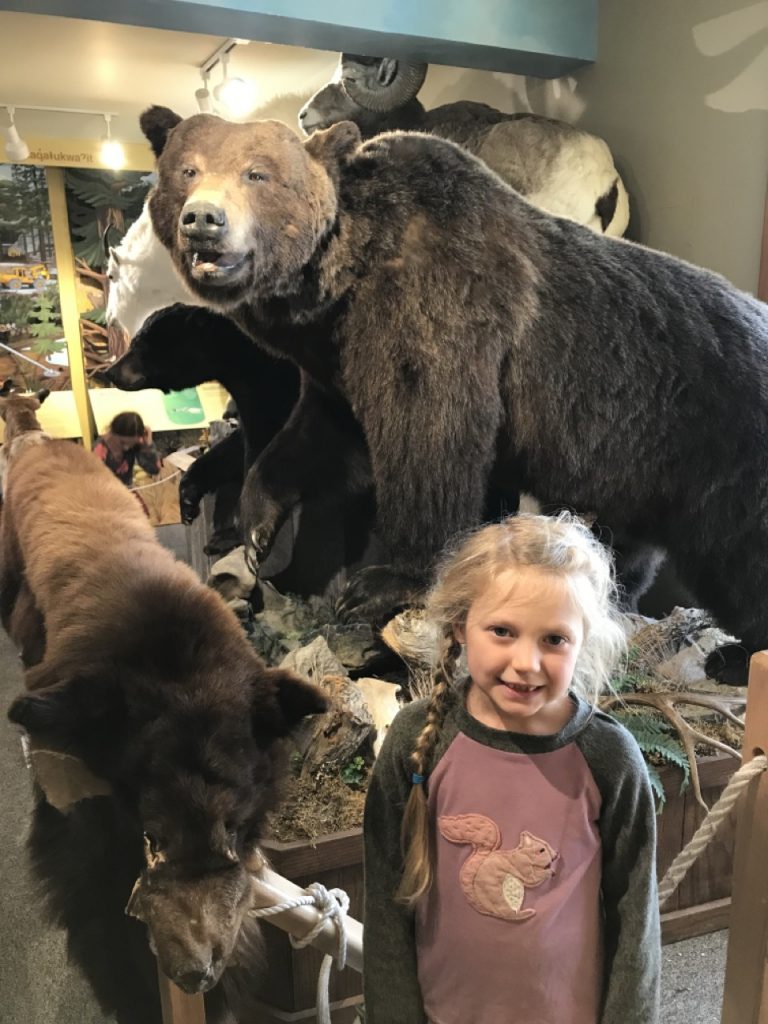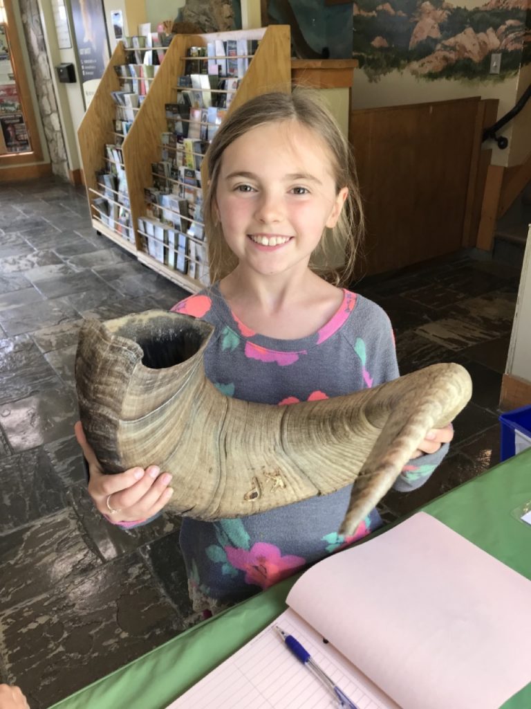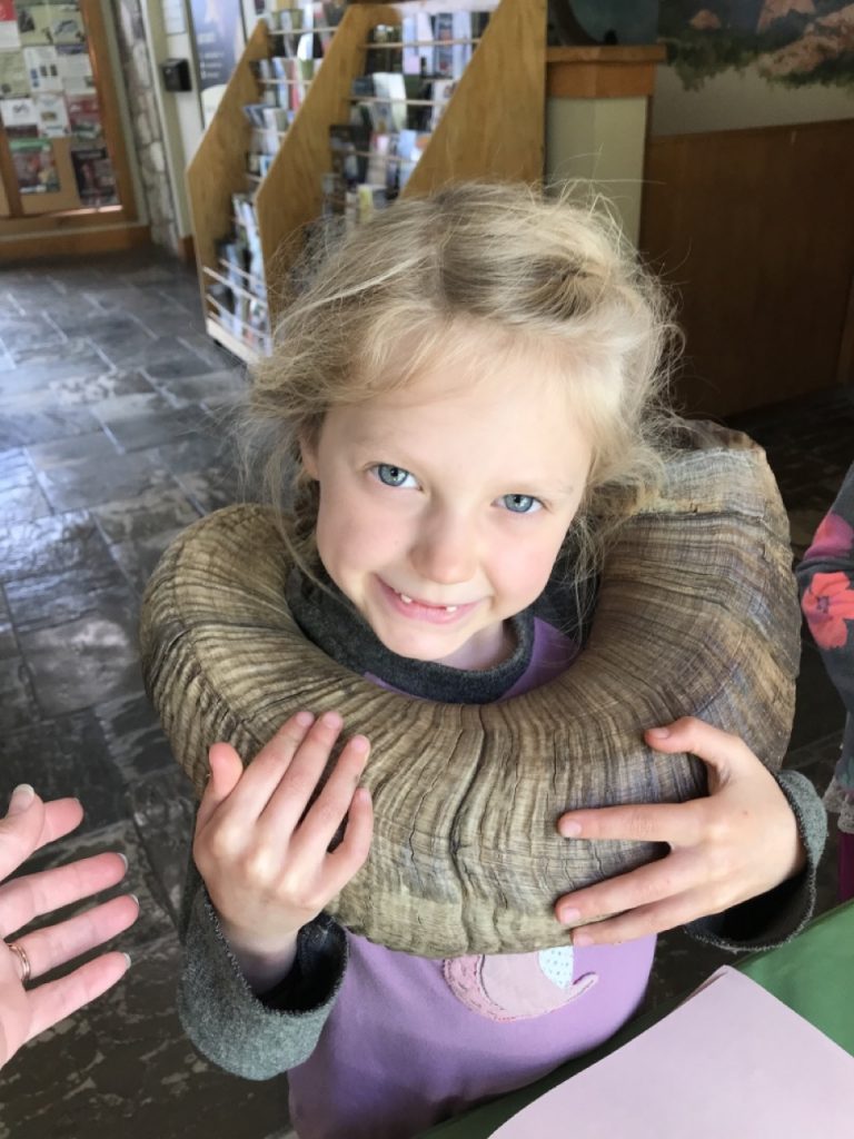 The visitor center was in the town of Radium Hot Springs that is just on the border of the park and though it didn’t have any books, it had a nice little museum.  The girls got to hold a bighorn sheep horn there.  They are so heavy!  Together they weigh 60lbs!  Imagine holding a 60lb dumbbell on your head every day and throwing it around with a flick of your neck when you are disgruntled.  Strong necks!