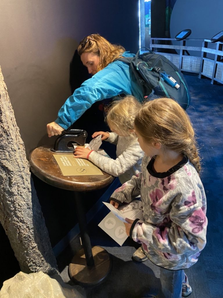 At the top there was a lookout center which was huge! I can’t imagine how they got all the supplies up the mountain for the construction. I’m sure most had to be airlifted there! The building on top had a museum, a gift shop, restaurant, cafe and a rooftop lookout and restaurant on it. The museum was really well done with stamps for kids to collect at different points throughout. We learned that the reason why the lakes look so blue is due to “rock flour” or tiny grains of rocks ground up by moving glaciers. The rock flour interacts with light rays and reflects what we see as the blue-green-teal color.