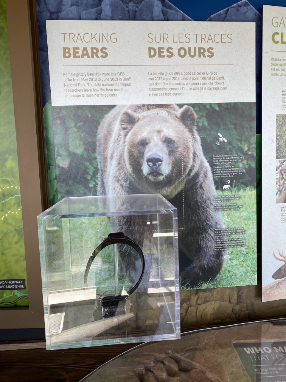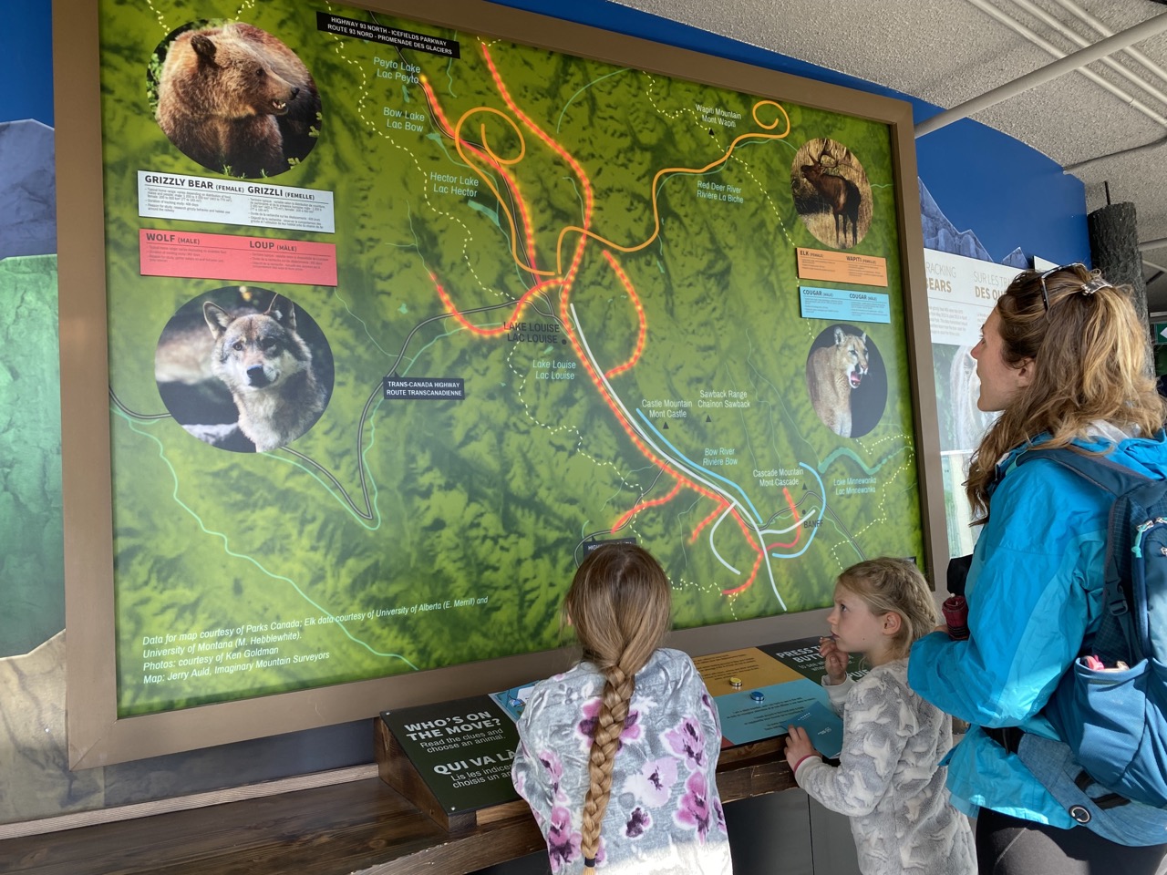 We also got to see what a tracking collar looked like up close and look at the information gathered by the tracking data. There was a display showing the paths various animals have taken. Many of the animals followed the man made roads with the exception of the moose who followed the rivers.