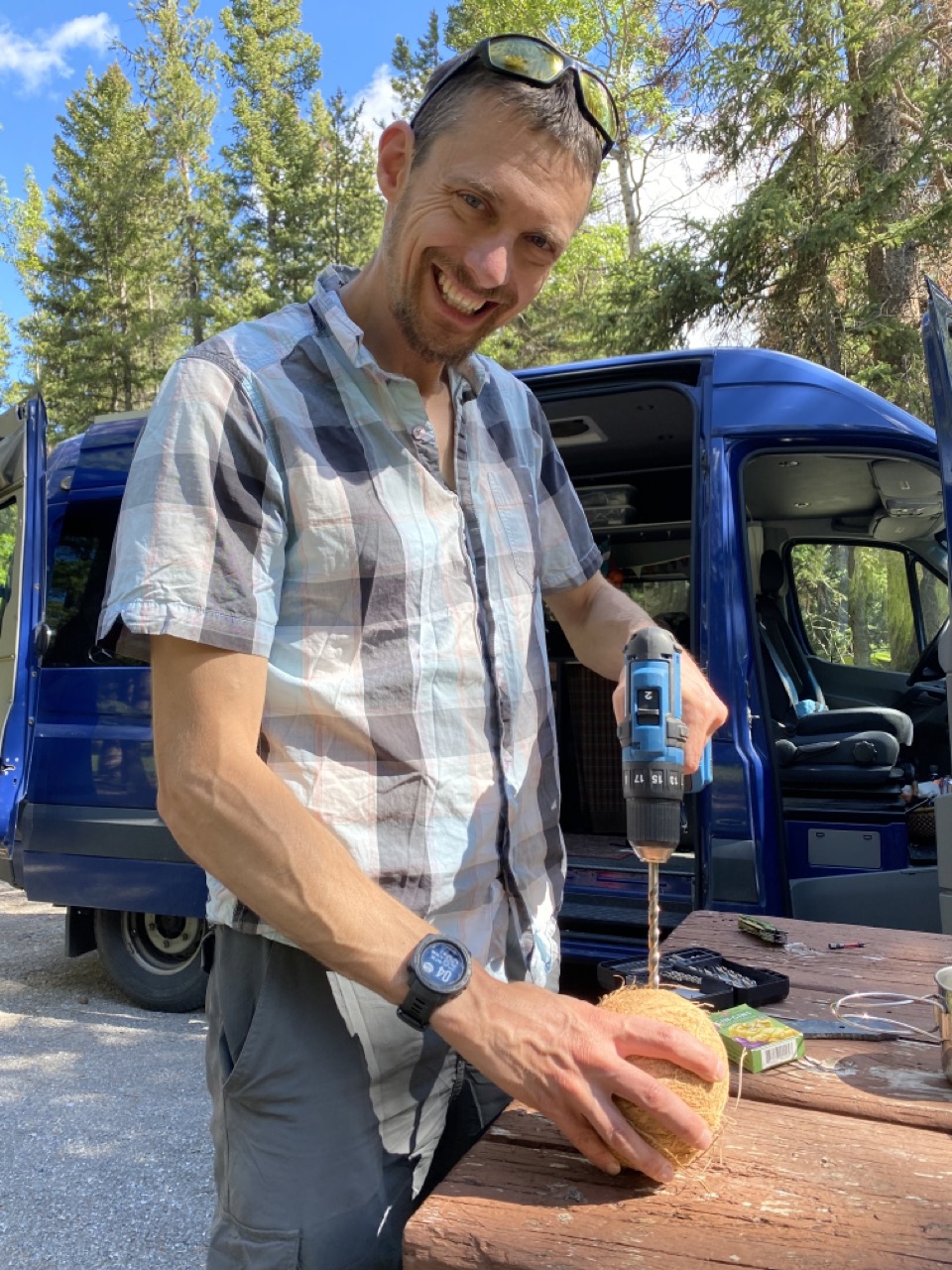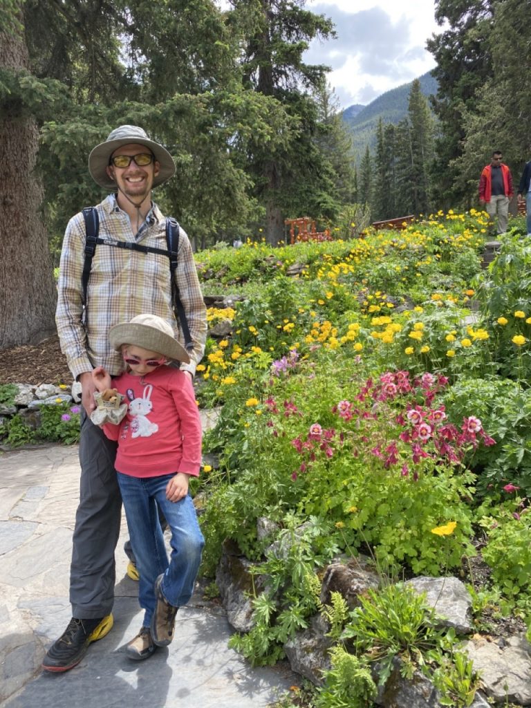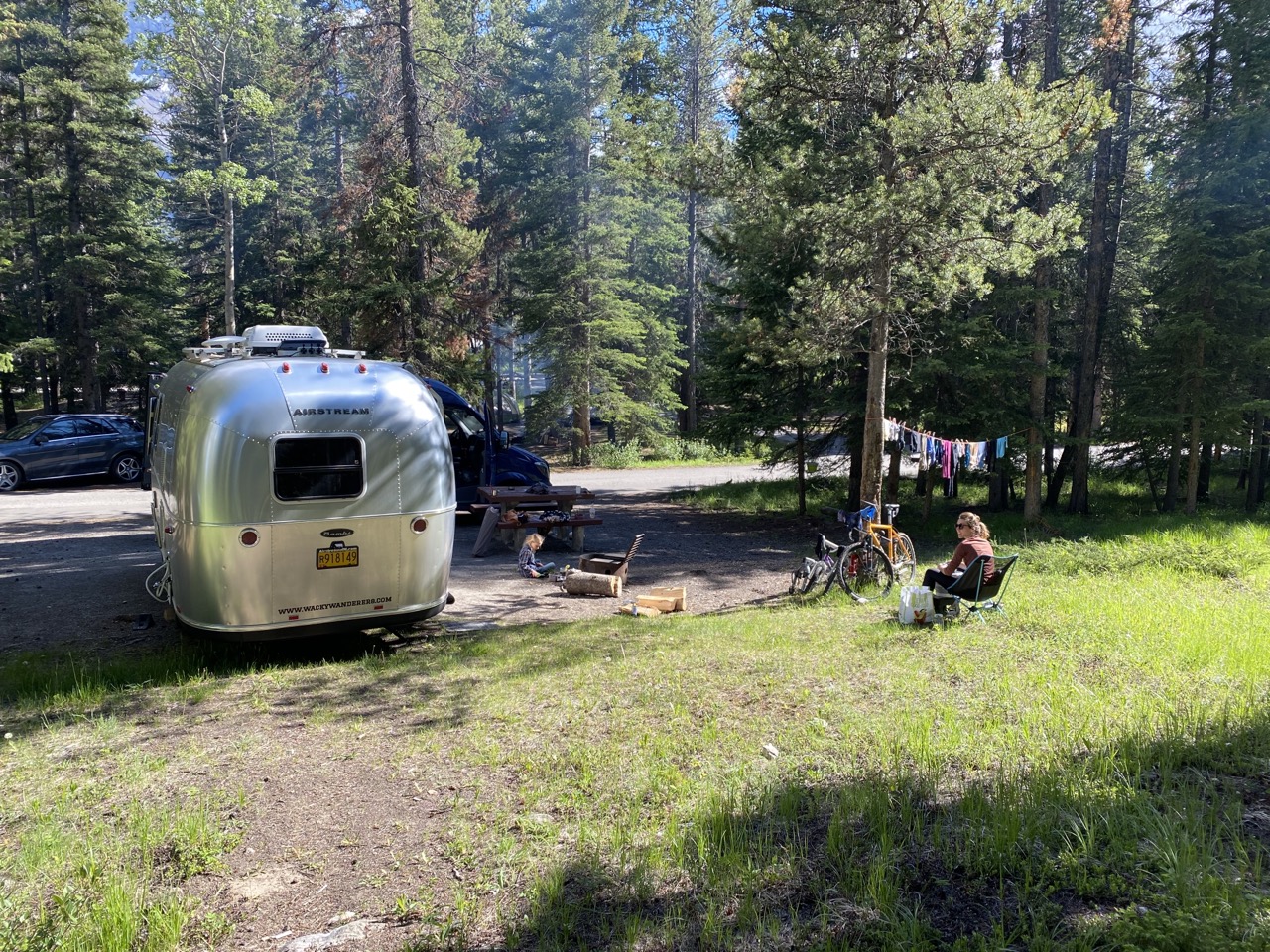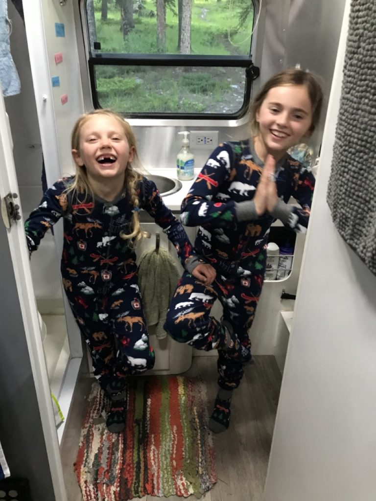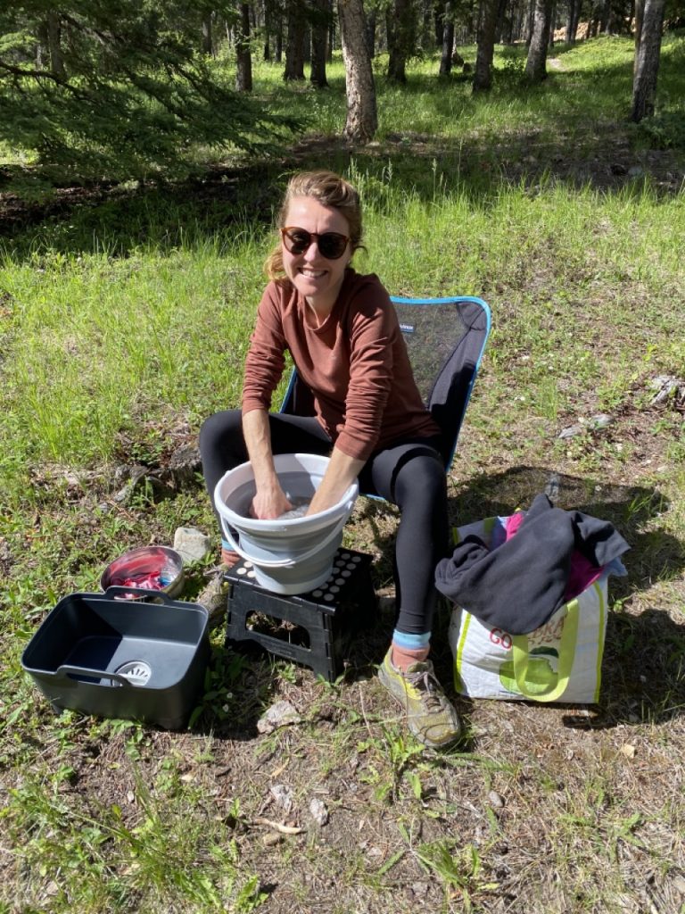 Back at camp we had some housekeeping things to do. We were in desperate need of some clean laundry. Laundry at a laundry mat ends up taking up the better part of an afternoon and since there was just so much to see in Banff we didn’t want to waste that time. So, I washed everything by hand! It was a full load of laundry so it took some time but the girls got to play while I was washing and Justin busied himself cracking open and cutting up a coconut the girls had picked out in a grocery store. It worked out just fine.