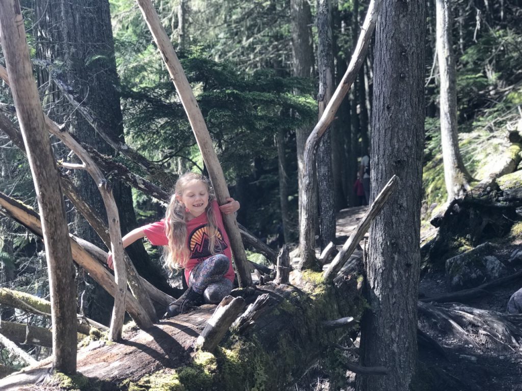 Before long the trail had opened up from the dense forest to reveal beautiful views of the surrounding mountains.  The kids found some great downed trees to play on while the adults soaked in the views and snapped some photos.