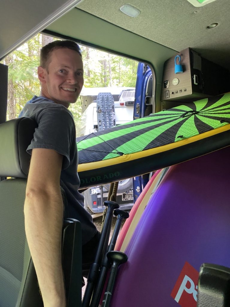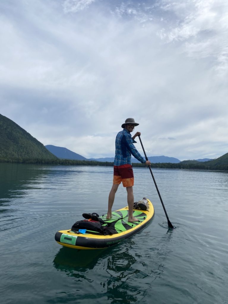 That evening Justin and our friends paddled all the paddle boards out on Lake McDonald again.  This time, instead of going by the boathouse by the camp loops we all went into Apgar Village, also on Lake McDonald, to paddle.  Some folks got take out from the restaurants there but since there were no safe gluten free options we made our dinner in Azul, our van.  We got some drinks to go instead and paddled around.
