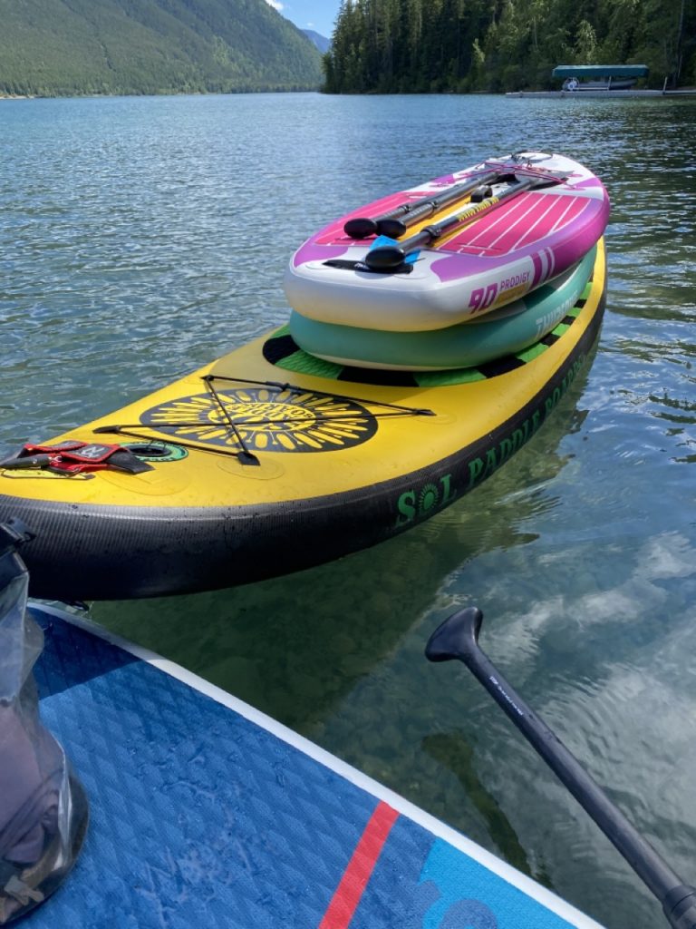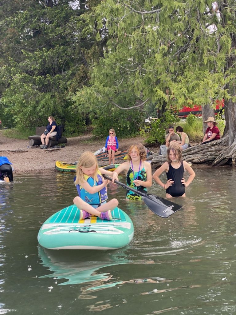 That evening Justin worked really hard and got all 5 paddle boards blown up and out on the water.  It was a bit of a rush getting them out and giving the kiddos a chance to play on them before it was time to head back to camp to make dinner but the kiddos did love it and that made Justin happy.