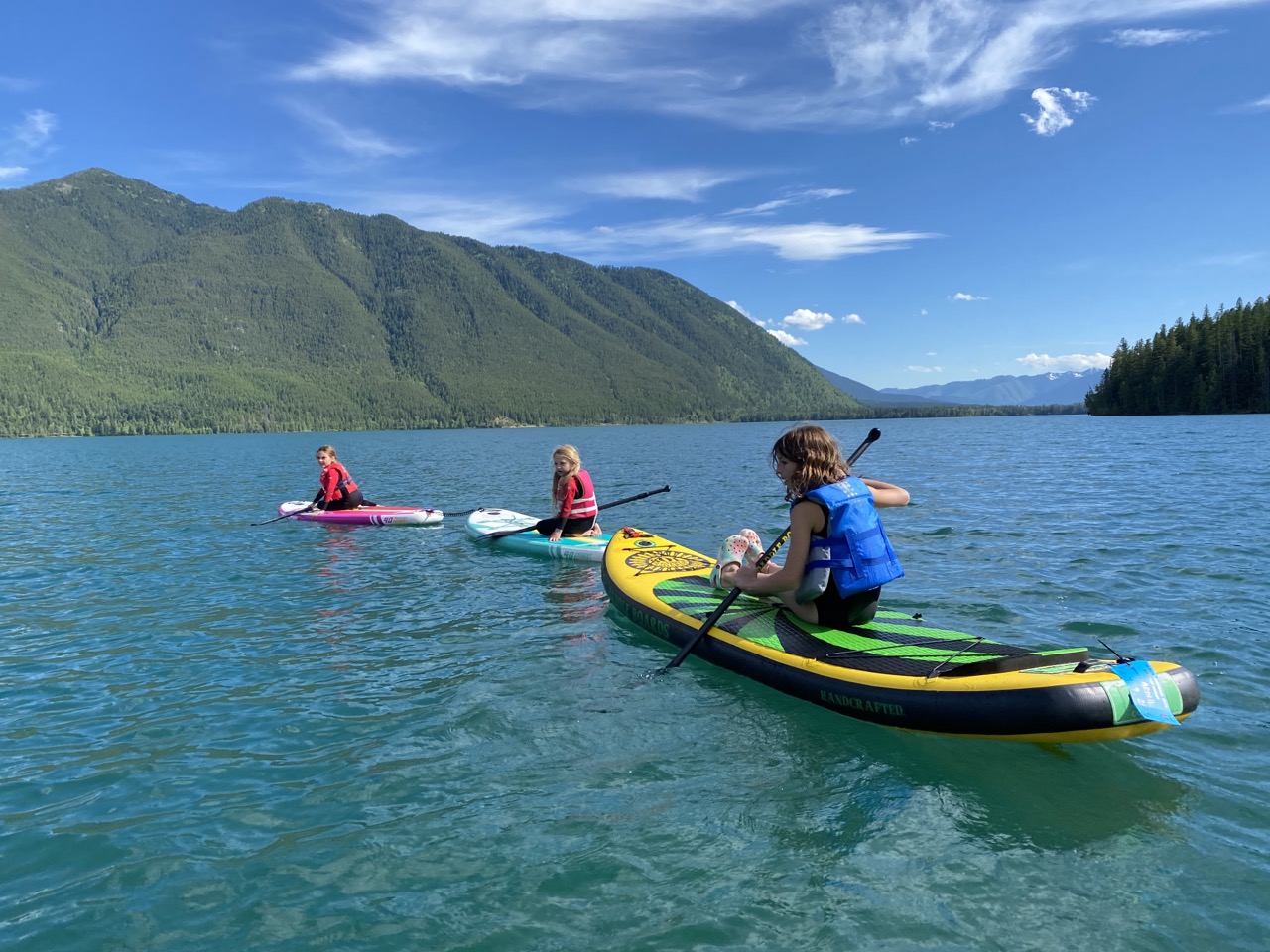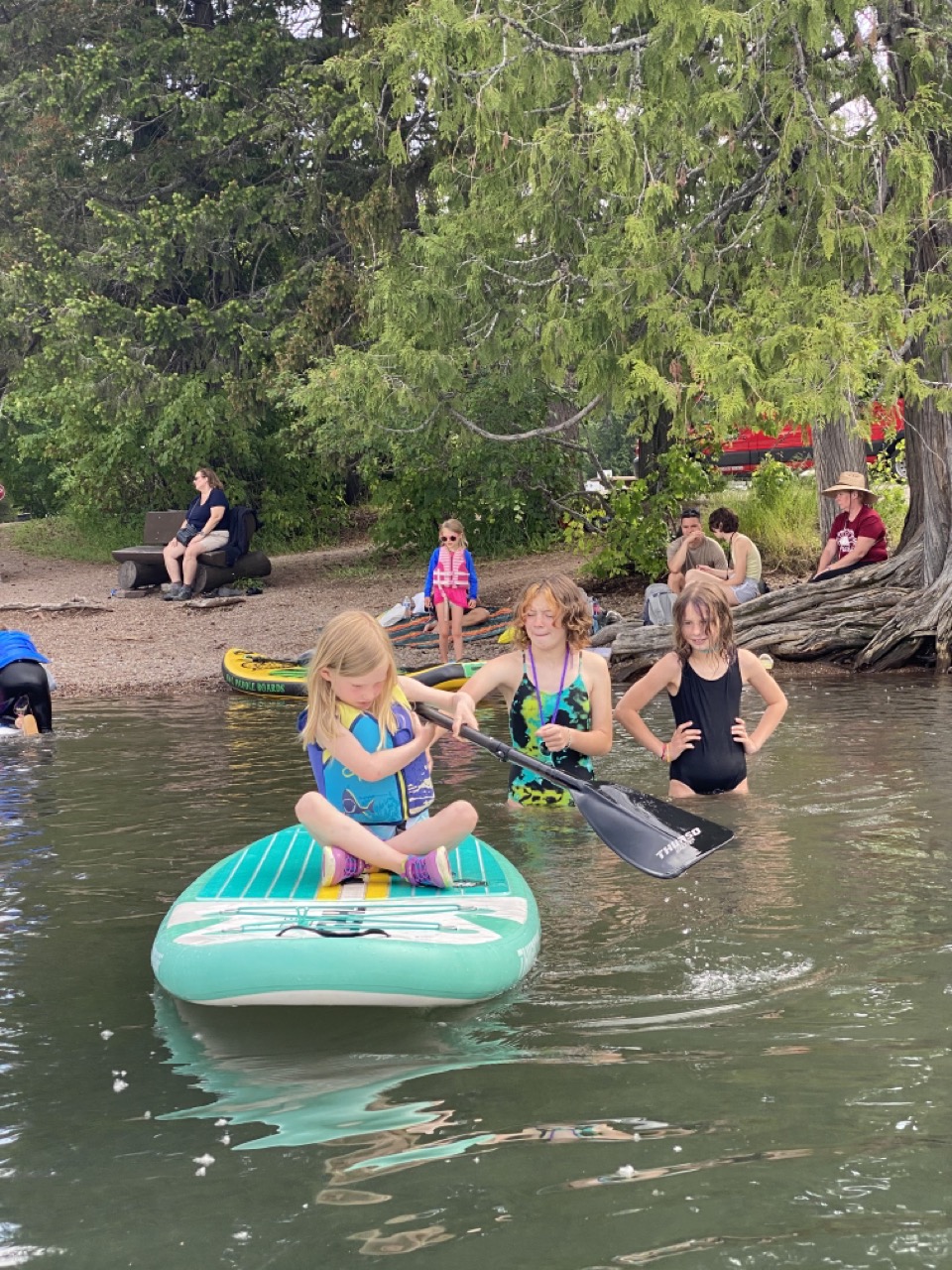 That evening Justin worked really hard and got all 5 paddle boards blown up and out on the water.  It was a bit of a rush getting them out and giving the kiddos a chance to play on them before it was time to head back to camp to make dinner but the kiddos did love it and that made Justin happy.