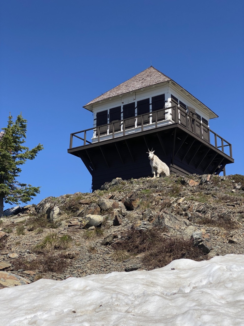 At the top they found Mountain Goats frolicking in the snow!  They first spotted them prancing down the mountainside off in the distance doing binkies like our bunnies.  If you have never experienced an animal doing a binki it is like a spastic jump with a little happy twist at the height of the jump.  It is super cute!  The Mountain Goats came right down to them.  The goats were all around the lookout tower up top and didn’t seem to be fazed by the human hikers in the slightest.  They even seemed to be posing for some of the pictures.  Justin said they were very curious and had funny long legs.