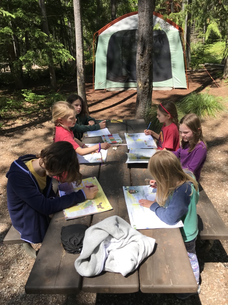 Meanwhile while most of the adults were hiking, another good friend, her sister and I were in charge of the kiddo crew.  The kids loved the time together to play and work on their Jr. Ranger books together.  It had a very ‘one room schoolhouse’ feel when all the kids were working on their books, the youngest not writing yet and the oldest being 10 years old.  So sweet!